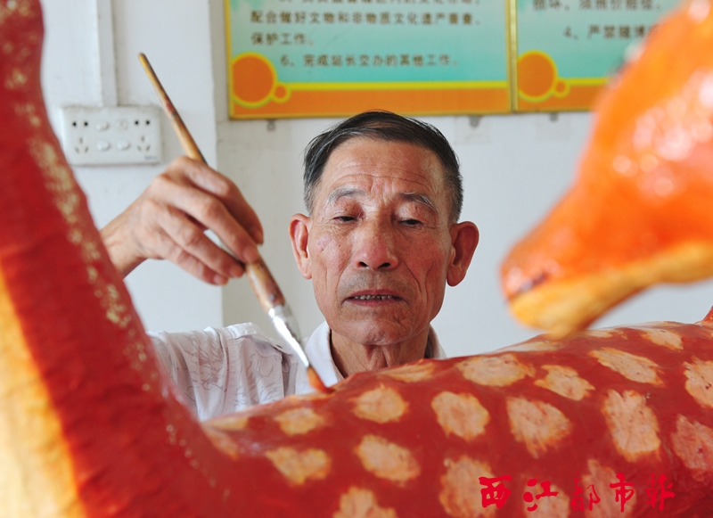 ????“鹿兒”的雛形出來后,就要糊紙著色了。今年70歲的鐘鐵堅擅長根雕、上漆和繪畫。根據竹編“鹿兒”的框架大小,鐘鐵堅把紙張裁剪成大小不一的條形狀并涂好糨糊,然后緊緊貼在“鹿兒”框架身上,一共需要貼八層,令整只“鹿兒”的體態豐滿起來。