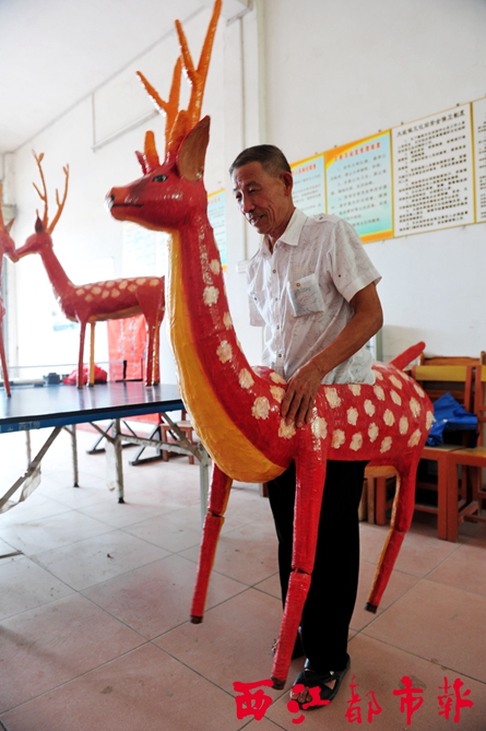 看到親手制作完成并將在演鹿兒戲時派上用場的“鹿兒”,鐘鐵堅露出了滿意的笑容。