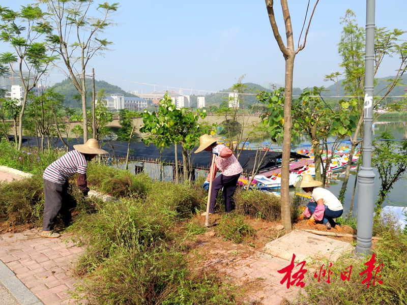 ?9月25日,數名工人在玫瑰湖公園環湖道路旁除雜草、種植物。 臨近國慶,我市部分街道、公園紛紛布置鮮花造型、增添植物,營造節日氛圍。 梁燕如 攝