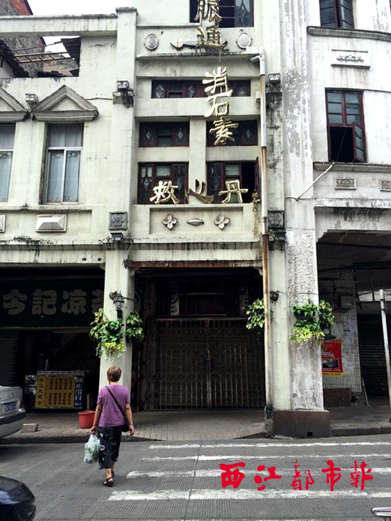 ????9月28日上午,記者來到上述地點,看到大中路上有一家名為“中×參茸保健藥業集團”的藥店,其外墻懸掛著“脈通”“消石素”和“救心丹”等幾個金漆大字。經觀察,懸掛最高的“脈通”廣告字固定在一個小鐵架上,鐵架用鐵絲固定在外墻的柱子上。位于中間的“消石素”三個字則是由一根鐵棍串聯起來,用從三樓吊出的鐵鏈將其懸掛起來。而位于最下方的“救心丹”三個大字,則是被擺放在二樓的窗臺上,用一根鐵絲綁住了其中的“心”字。