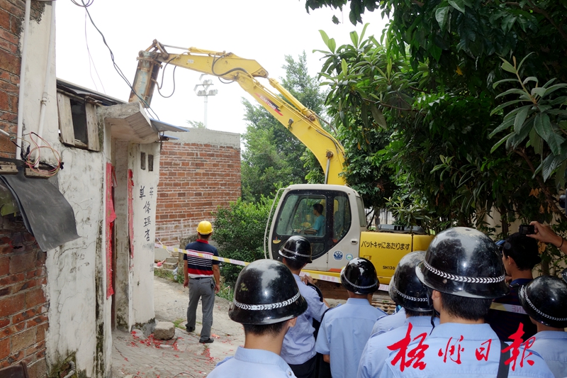 9月30日上午,在長(zhǎng)洲區(qū)菊湖路,我市有關(guān)部門(mén)組成的聯(lián)合執(zhí)法隊(duì)正在使用機(jī)械對(duì)違章建筑物進(jìn)行依法強(qiáng)制拆除。梁萍 攝