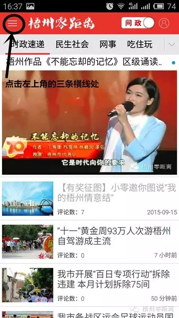 ????打開“梧州零距離”客戶端后,點擊主頁左上角的三條白色小橫線處。
