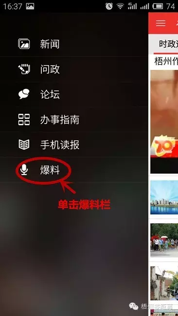 ????在隨后彈出的功能欄里,單擊“爆料”欄。