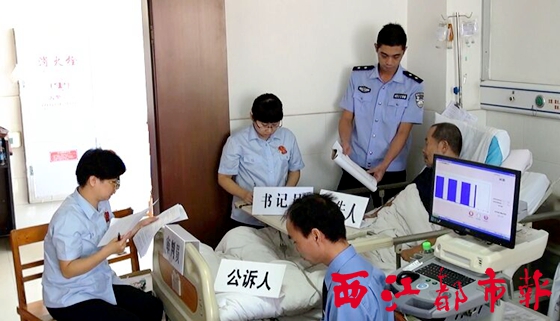 ??? 西江都市報訊 近日,梧州市中醫(yī)醫(yī)院某病房內(nèi)出現(xiàn)了一些特殊的訪客,他們是長洲區(qū)法院的法官、書記員和法警,以及長洲區(qū)檢察院的檢察官。他們在病房內(nèi)設(shè)立了臨時特別法庭,開庭審理一起盜竊案。