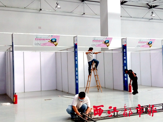 施工人員在珠寶展區(qū)搭建展位。 西江都市報記者 朱元冬/攝