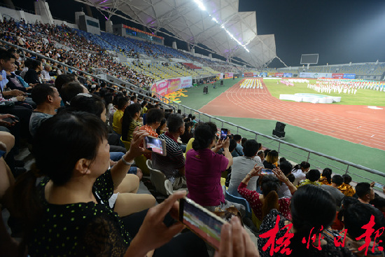 ????廣西第十三屆運動會今日在我市的中恒體育場舉行開幕式。6日晚上開幕式進行了最后的著裝彩排,吸引了數千市民群眾前去體育場觀看,提前感受區運會的盛大熱烈。 李鴻榮 攝