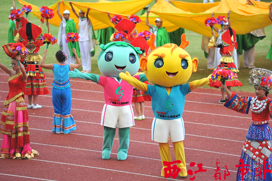 ????西江都市報訊(記者 謝韻)11月7日下午,梧州市中恒體育場里,伴隨著節奏明快的開幕式音樂響起的是觀眾席此起彼伏的掌聲和歡呼聲。看著綠蔭場上的國旗方隊、區運會會旗以及裁判員、運動員方隊的出場,氣勢恢宏的千人文體表演,觀眾們感到激動、震撼的同時,也更因其含有的梧州元素而感動、自豪。