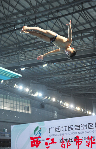 男子甲組跳臺決賽將當天的比賽推向高潮。梧州市代表隊在這場比賽中共派出陳明宇、羅宇樂、莫任龍三名選手,其中,此前表現平平的莫任龍突然發力,從第二跳開始就展現出強勁實力,完美的入水更是頻頻獲得觀眾掌聲,以領先第二名50分的優勢將金牌收入囊中?!斑@次是在主場作戰,觀眾熱情的掌聲給了我很大的鼓勵,我有兩個動作都超常發揮了。”莫任龍說。
