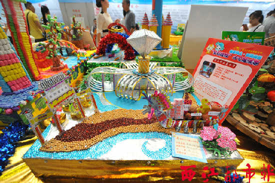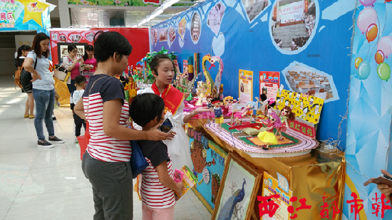????“叔叔阿姨,歡迎來到龍圩區展區,請允許我給您介紹一下我們的作品?!痹趯毷尥薏潘囌沟恼箙^內,許多笑容甜美、解說流暢的小解說員也是一道亮麗的風景線。