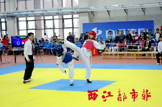 ????隨后上場的覃敏也與對手覃佳佳展開攻防大戰,覃敏的多次飛踢都被對方巧妙地用手化解。在次回合里,覃敏率先加大進攻,并三次踢中對方的頭部。隨后,痛失9分的覃佳佳因不太敢發動進攻,而一度被裁判警告。最終,覃敏以13∶0的戰勝對手,挺進決賽。如此一來,梧州隊已提前將該項目的金牌收入囊中。