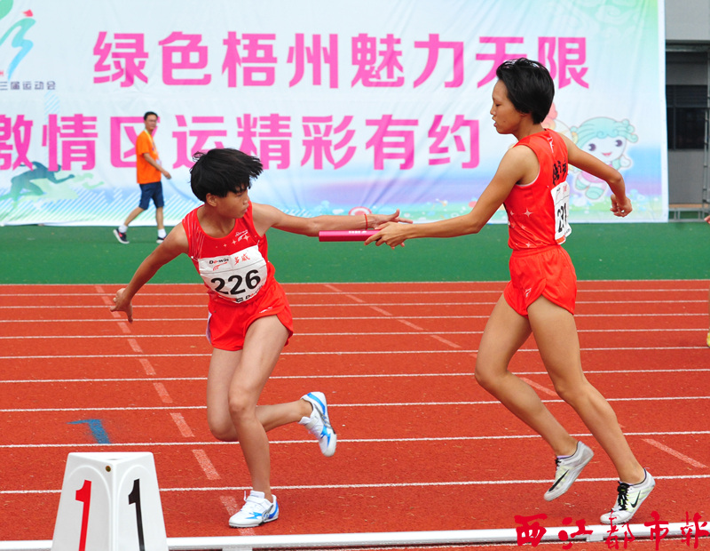 廣西第十三屆運(yùn)動(dòng)會(huì)上,梧州隊(duì)在女子丙組4?X?400米接力賽中獲得冠軍。?陳健新/攝??(資料圖片)