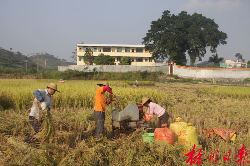 ????藤縣共種植32.8萬畝晚稻。近日,當地農民趁天氣晴好抓緊搶收。今年該縣推廣測土配方施肥、超級稻、病蟲害綜合防治等技術,晚稻豐收在望。 黃群禮 攝