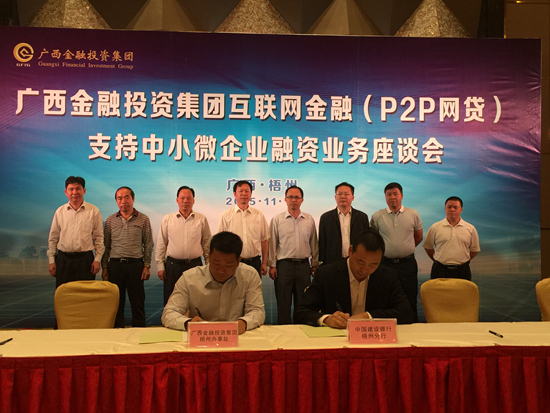 11月19日,梧州市金融工作辦公室與廣西金融投資集團有限公司梧州辦事處在梧州市國龍大酒店召開了“廣西金融資集團互聯網金融(P2P網貸)支持中小微企業融資業務座談會”,梧州市副市長吳浩嶺以及部分市局、部分金融機構、企業負責人參加了會議,建行梧州分行副行長李進軍應邀參加了會議并發言,會上,建行梧州分行與廣西金融投資集團有限公司梧州辦事處簽訂了《全面業務合作協議》。