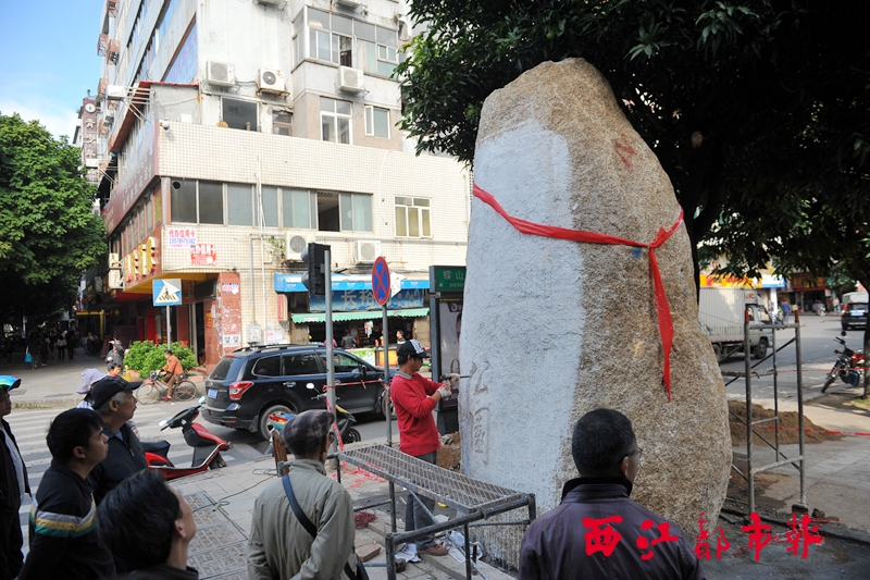 ??? 11月30日,工匠在新設置于潘塘公園入口人行道西南的觀景石上雕刻“梧州市法制文化公園”名稱。當日,工匠開始在4米多高,30多噸重的岑溪紅石料上雕鑿公園名字,難得一見的雕刻場面,吸引了較多市民圍觀。