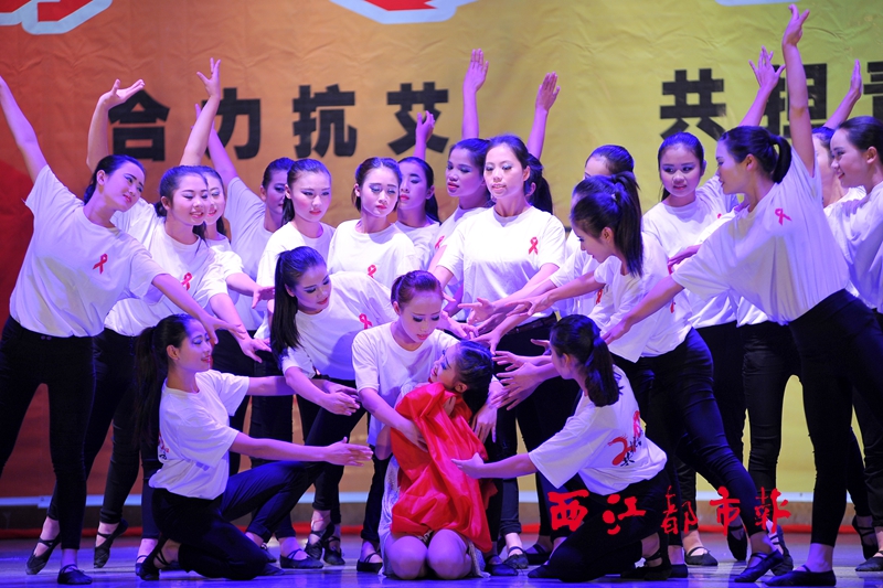 ?12月1日,梧州市衛生學校的學生在晚會上表演情景舞蹈《情系紅絲帶》。當晚,梧州市防治艾滋病工作委員會辦公室在市政廣場小舞臺舉行2015年世界艾滋病日專題宣傳晚會,梧州市內多家單位派出節目參加晚會表演,共同宣傳防艾工作。 西江都市報記者 何鎏/攝