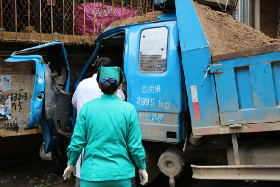 ????在車尾不遠的石階處,半躺著一名大約四五十歲的中年婦女。據周邊圍觀市民說,該中年婦女已經遇難。“當時貨車在斜坡處正準備卸掉車上的沙,但是當司機回到駕駛室時,不知為什么貨車就往下開了,司機好像也沒剎住車,而那位中年婦女本來是和另兩個人并排一起往山下走的,她(中年婦女)走在中間,后來發現貨車往她們開來時,旁邊兩人躲開了,她卻不幸被撞上了,醫生來到現場時,她已經沒氣了。”一名自稱看到當時情況的圍觀市民說。也有消息源稱,中年婦女是在駕駛室里被救出來的,救出來時已經遇難。關于這點,有關部門目前沒有給出確切說法。 ????據一名住在文瀾路環山道一級1號的阿姨說,上午10時50分左右,她在家聽到了“嘭”的一聲巨響,走到家里的陽臺看,才知道是一輛藍色貨車撞向了她隔壁的那棟樓。