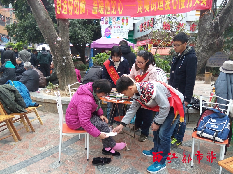 2月18日,學生志愿者在新興小游園幫忙賣愛心鞋墊,一位市民正在試鞋墊。西江都市報記者 吳艷虹/攝