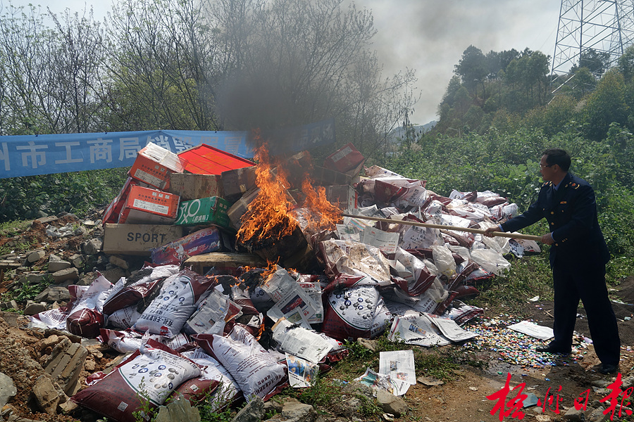 3月14日,在市垃圾處理場,市工商局工作人員對假冒偽劣商品進行集中銷毀。 曾燕 方堅宗 攝