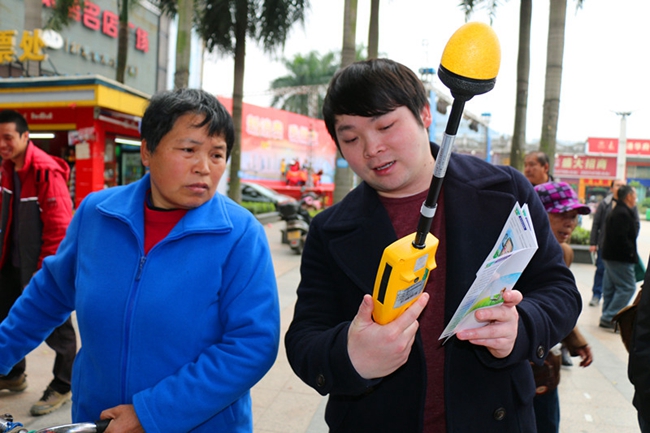 ????“那手機的輻射大不大,符合標準嗎?”,“一邊充電一般用手機輻射是不是會更大?”活動現場,不少市民踴躍向工作人員咨詢。工作人員解釋稱,手機的輻射一般在0.0011~0.0032mW/㎝2 間,屬于正常范圍,市民大可放心。為了讓市民更直觀地了解電磁輻射,活動現場工作人員還使用工具現場檢測了電磁爐、微波爐等家電運行狀態下產生的電磁輻射值,與手機、基站等輻射值進行一一對比。對比檢測發現,手機待機及通話狀態下的電磁輻射值,以及基站發射的電磁輻射值均較電磁爐、微波爐等家電的電磁輻射值還要小很多。市民梁雪將自家的電磁爐拿到現場給工作人員檢測,數據顯示該電磁爐在使用時產生的電磁輻射為0.004mW/㎝2 ,屬于標準范圍內。梁雪稱:“測過之后及格我就放心多了,不用擔心電磁輻射太大會危害到身體健康。”