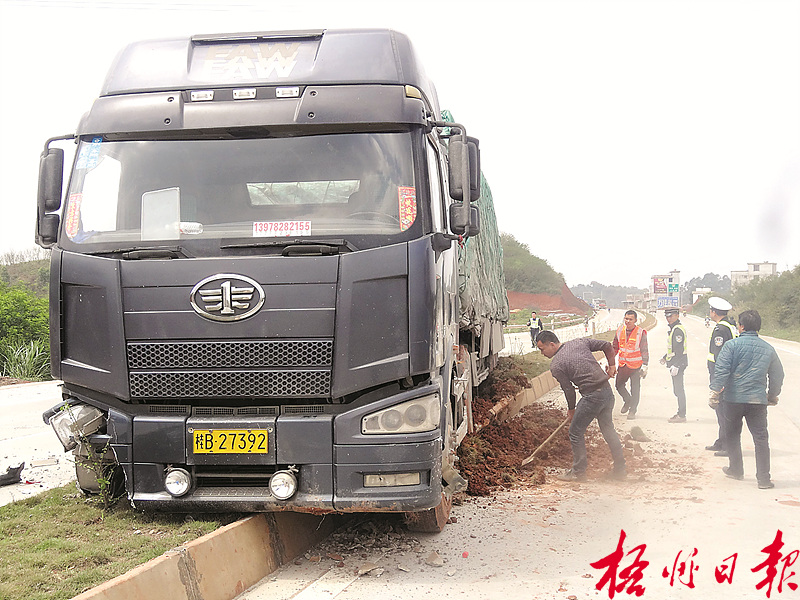 ????據事故現場民警介紹,當天上午10時30分,一輛從南寧開往梧州方向的外省大貨車至上述路段,因突然失控先是與一輛同向行駛的寶馬車發生追尾碰撞,?后司機往左邊急打方向,至失控大貨車沖上路中間花基分隔帶,撞爛分隔帶10多米,事故導致車輛損壞,幸無人員傷亡。 李偉明 攝