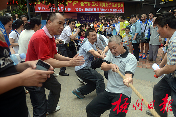 4月16日,在山海觀廣場,梧州日?qǐng)?bào)社隊(duì)正與對(duì)手角力。當(dāng)日,由市總工會(huì)主辦的“天河地產(chǎn)杯”全市職工拔河男女子混合賽拉開戰(zhàn)幕。此次比賽共有32支隊(duì)參加,以三局兩勝淘汰制決出名次。 李煜榮 攝