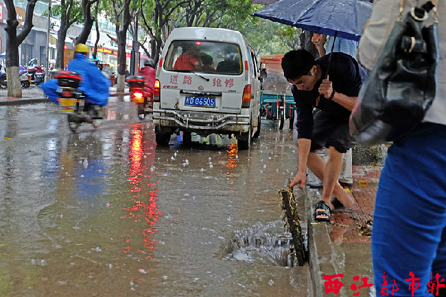 4月20日,在大學(xué)路,值守的市政工作人員打開(kāi)下水道口,讓路面的積水加速排走。 西江都市報(bào)記者 何鎏/攝