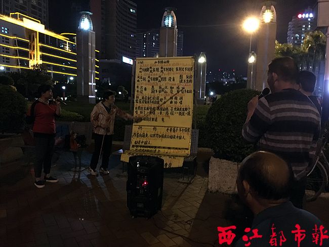 ????近日晚上8時,記者來到市政廣場進行走訪。此時的市政廣場已十分熱鬧,有家長帶著孩子在玩耍,有大媽們在跳廣場舞,還有不少市民在散步、乘涼。而這其中,有這樣一群老人,他們聚集在廣場的一角放聲歌唱。記者看到他們的設(shè)備比較簡單,一臺能播放音樂的音箱,公共椅子上放著一個支架,掛著事先準備好的歌詞,上面還抄了樂譜。一位婆婆正用棍子指著歌詞或教唱或提示旁邊拿著話筒唱歌的市民。一首曲子唱完又接著唱下一首,話筒傳給下一個人,歌聲一直不斷。有的圍觀群眾也會跟著旋律一起唱,因此歌聲越來越大,甚至有時還蓋過了旁邊播放的廣場舞音樂。歌聲、音樂聲夾雜在一起,十分嘈雜。