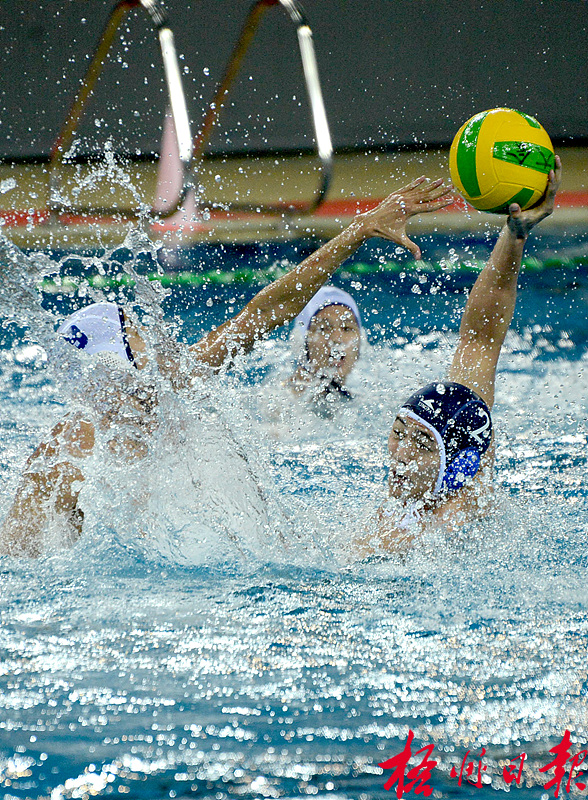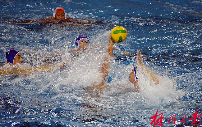 ????當天上午的最后一場比賽是A組預賽第一輪的最后一場比賽,由廣東隊對陣湖南隊。由于兩隊都是國內水球技術一流的隊伍,兩隊之間的交戰十分激烈,吸引著全場觀眾的目光。比賽一開始,廣東隊率先搶占了先機,將水球牢牢控制住,兩三次傳球后,該隊10號隊員就一個快攻射門得分。湖南隊近年來在全國水球錦標賽中表現勇猛,隊員擁有良好的心理素質,這場比賽,他們緊盯廣東隊,在對手帶球前進時快速追趕,且防守嚴密。整場比賽,兩隊隊員互相競技,賽場水花飛濺,打得激烈。最終,雖然湖南隊奮起直追,但還是不敵廣東隊,以9比3的比分輸了該場比賽。