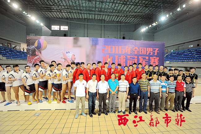 4月27日,在市游泳(跳水)館,市長朱學慶為2016年全國男子水球冠軍賽冠軍隊伍頒獎。?蒙紹松??攝