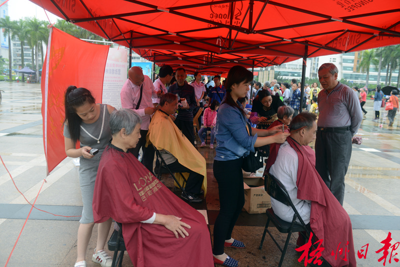 4月30日,在市政廣場,市總工會志愿者為市民理發。為慶祝“五一”國際勞動節,市總工會當天組織舉辦“中國夢·勞動美”全市工會服務職工和農民工活動,為市民提供用工招聘、理發義診、業務咨詢、政策宣傳等服務,并開展多項游園活動。?李煜榮?攝