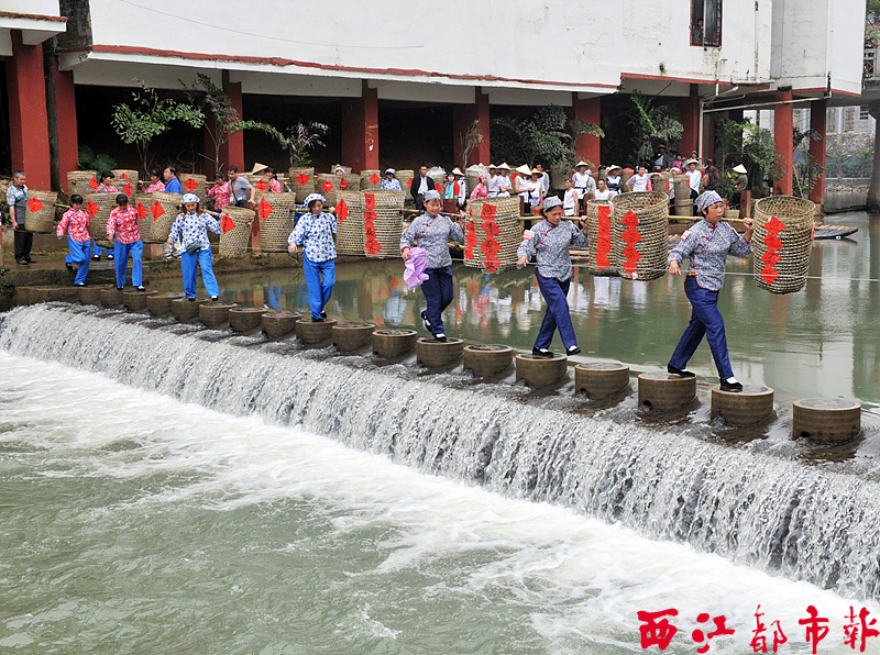 ????4月30日,六堡鎮的茶農們頭戴竹帽,每人肩挑兩竹筐茶葉,組成浩浩蕩蕩的隊伍前往合口碼頭廣場。隊伍到達碼頭,茶農們祭拜茶神之后,便將一擔擔六堡茶有序地放到竹排上,向梧州運去。這段原汁原味的表演,吸引了大批游客觀看。六堡街兩旁站滿了遠道而來的攝影發燒友,他們用照片記錄下這一個個精彩的瞬間。