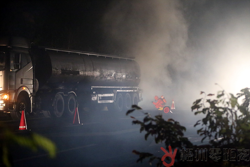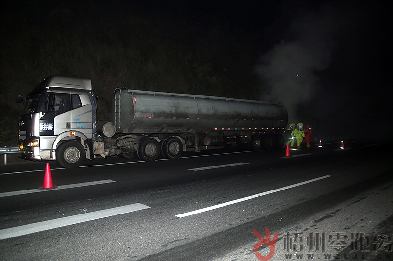 ????梧州零距離網訊 2016年5月2日18時55分,梧州市消防支隊指揮中心接到110轉警:蒼碩高速梧州往貴港方向一公里處一輛裝有28噸硝酸的槽罐車發生泄漏事故。接警后,梧州支隊立即調派特勤中隊3輛水罐車、1輛搶險救援車32名官兵趕赴現場救援,藤縣中隊1輛水罐車、1輛搶險救援車12名官兵前往增援。