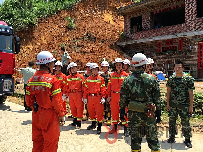 ??? 梧州零距離網訊? 今日(5月10日)上午8時50分,梧州市消防支隊指揮中心接到110轉警:梧州市梨埠鎮馬進村發生山體滑坡4人被困。接警后,梧州支隊立即調派河西中隊,特勤中隊共3輛水罐車、2輛搶險救援車、1輛搜救犬車、38名官兵趕赴現場救援。