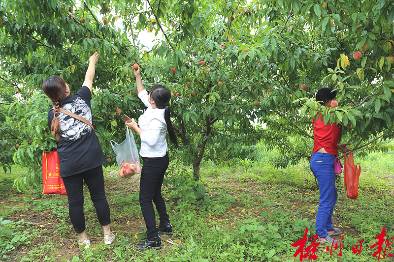 5月18日,在岑溪市糯垌鎮古河村農業旅游生態園,游客們采摘品嘗水蜜桃。陳可夫 攝