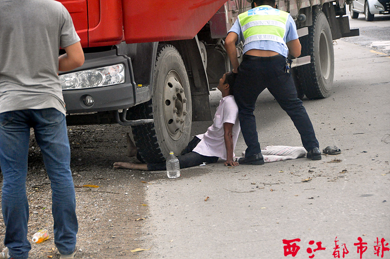 ????當天上午,蒙山交警大隊的協警黃瓏錦和同事正在321國道上巡邏。臨近中午,黃瓏錦一行途經蒙山縣西河鎮壬山路口時,突然看到前方發生了一起大貨車和摩托車相撞的交通事故,一名男子坐在大貨車駕駛室一側的地上,雙腿已經被大貨車前輪死死壓住,動彈不得,并不斷發出痛苦的呻吟聲。
