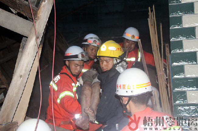 ????梧州零距離網訊 2016年6月3日4時29分,廣西梧州市蒙山縣城北街79號一民房發生倒塌,一名約80歲的阿婆被倒塌的墻體掩埋在廢墟中。接到報警后,梧州市蒙山消防中隊立即出動2輛消防車,12名官兵趕赴現場救援。