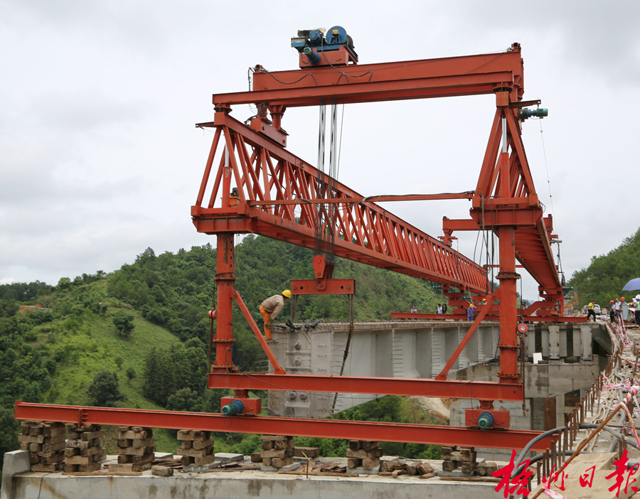 6月4日,施工人員在柳州至梧州高速公路藤縣段富悅1號大橋架梁。