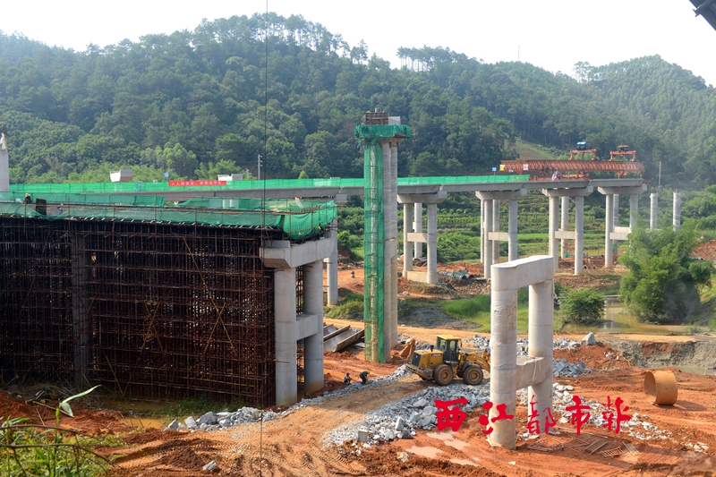 ?6月7日,正在緊張施工的梧州至柳州高速路項目倒水南互通路段,施工單位正抓緊梁架的鋪設施工。本報記者 蒙紹松/攝