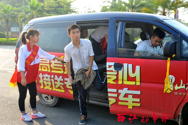 6月7日,在梧州高中門前,志愿者迎接由“黃絲帶”車輛送來的考生。 西江都市報記者 何鎏/攝