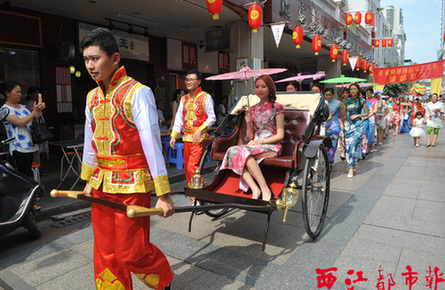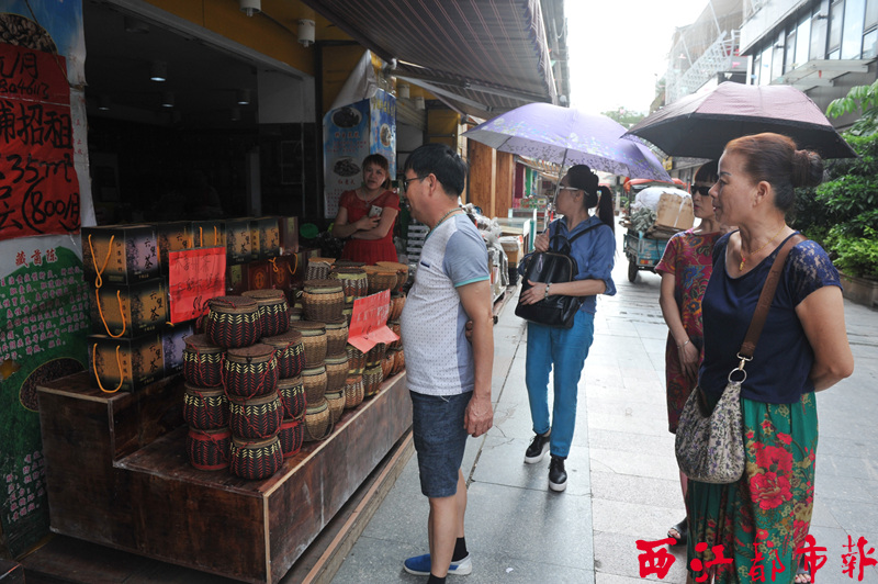 6月10日,前來梧州市參加2016年廣西嶺南風情旅游文化周的廣東旅游團,在鴛江麗港商業街舉行的嶺南優品匯一條街參觀和選購。其中,獨具梧州特色的龜苓膏和六堡茶尤其受游人青睞,很多游客將這些梧州特產作為這次旅游的手信買回家。 西江都市報記者 陳健新/攝