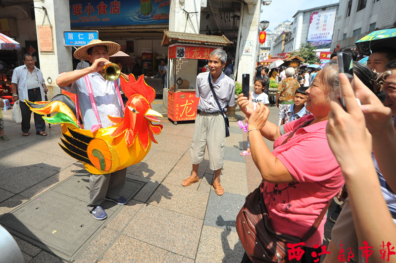 6月10日,在居仁路附近游玩的市民,開心地嘗試扮演“公雞”人偶,并歡快地吹起嗩吶。端午假期的第二天,告別了龍舟賽事的喧囂,不少市民游客都選擇到位于騎樓城的嶺南風情一條街逛逛,近距離感受嶺南風情,品嘗傳統小吃,享受端午假期難得的休閑時光。 西江都市報記者 何鎏/攝