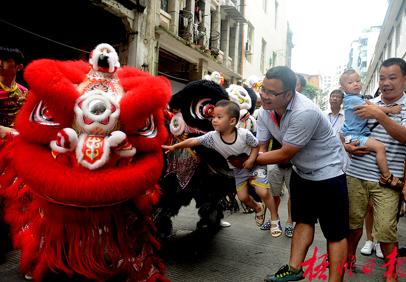 一名勇敢的小男孩伸手撫摸了獅頭。龍母文化匯內容之一龍獅巡游深受市民喜愛。