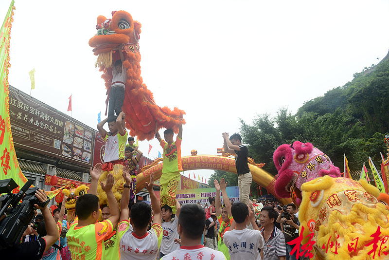 ????6月9日上午9時,一支龍獅隊伍浩浩蕩蕩地沿著西江一路向梧州龍母廟景區巡游,這是龍母文化匯內容之一——龍獅巡游賀誕活動,此次活動邀請了頗有名氣的周家館獅隊以及梧州本地民間龍獅隊前來表演。歡慶的龍騰獅舞在古色古香的騎樓城街道穿過,格外引人注目,吸引了市民朋友一路跟隨觀看,不少家長還帶著小朋友一起圍觀。精彩的龍獅巡游過后,《雙龍出海》、《群獅起舞》、《周家功夫》、《龍獅送福》等節目在龍母廣場逐一上演,為觀眾呈現了一場精彩的民俗文化表演。