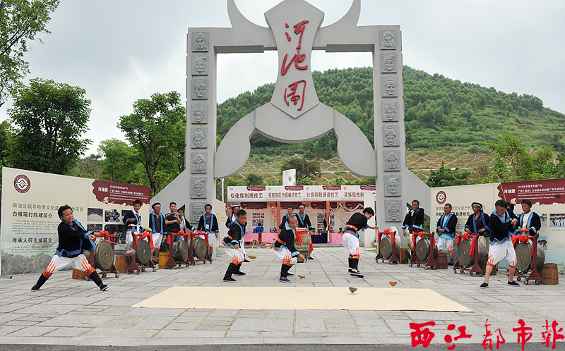 中國文化遺產日廣西主場城市活動期間,在梧州園博園河池園,白褲瑤正在展演打陀螺技藝。