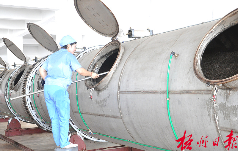 ????6月16日,在廣西梧州金益六堡茶業(yè)有限公司制茶車(chē)間,工人正通過(guò)30噸容積不銹鋼無(wú)級(jí)調(diào)速六堡茶發(fā)酵罐為茶葉均勻翻堆。