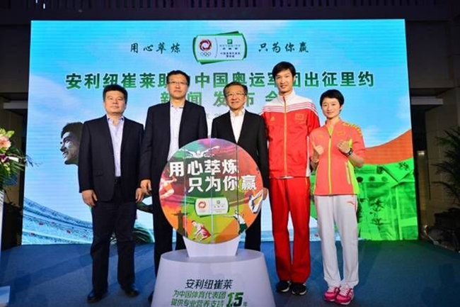 中國奧委會市場開發部李樺主任、王明晏副主任、安利(中國)總裁黃德蔭、奧運冠軍雷聲、奧運冠軍吳靜鈺共同助力中國奧運軍團出征里約