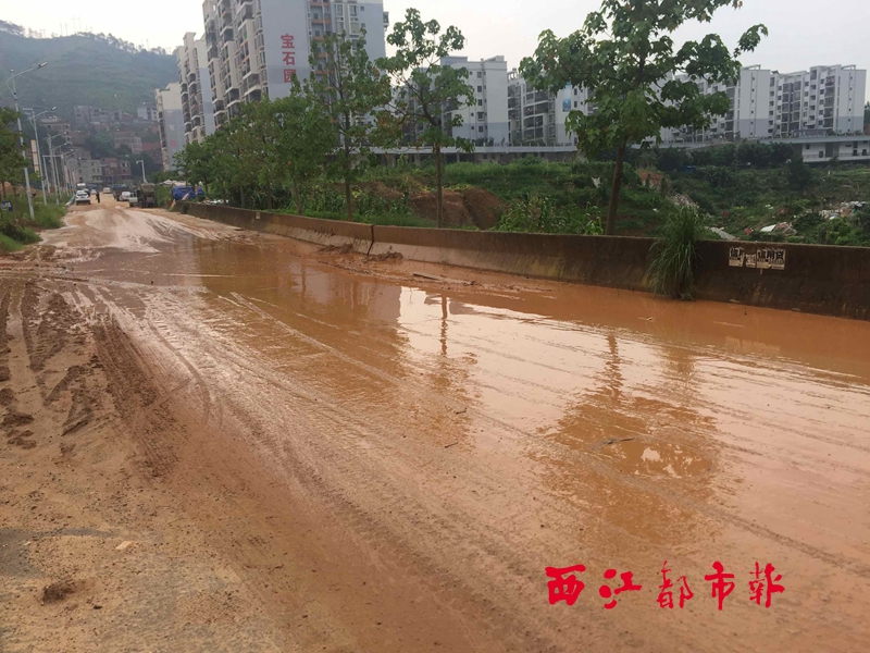 這段約百米長的道路,已全部被黃泥水所覆蓋,周邊居民的出入受到嚴重影響。 實習生 鄧發浩/攝
