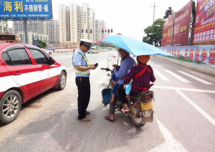 6月20日,梧州市公安局交警支隊龍圩大隊的民警在查處一輛加裝遮陽傘的摩托車。 (龍圩大隊供圖)