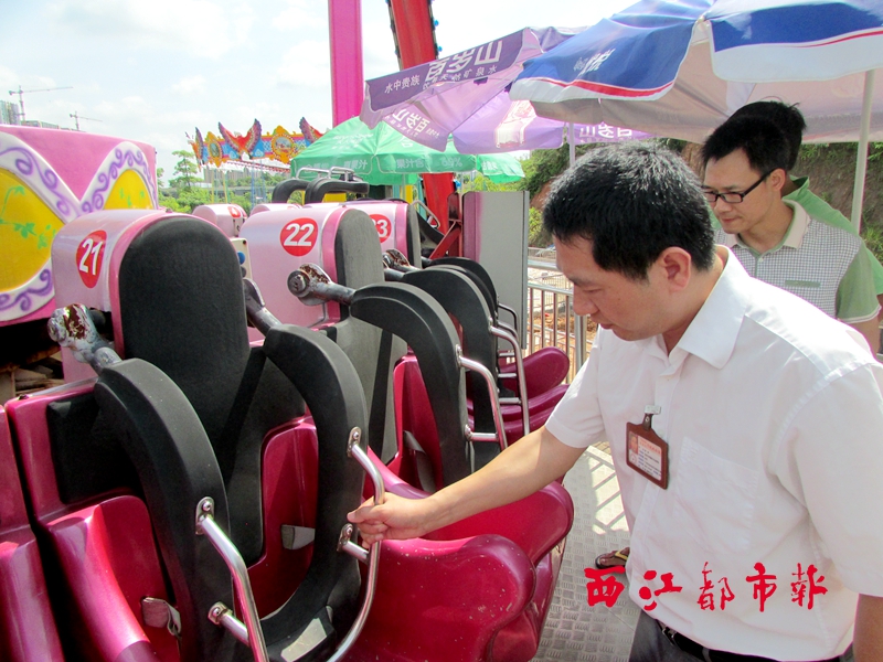 ?7月19日,在玫瑰湖公園主題樂園,執法人員檢查游樂設備安全防護措施是否落實到位。 (圖片由市質監局提供)