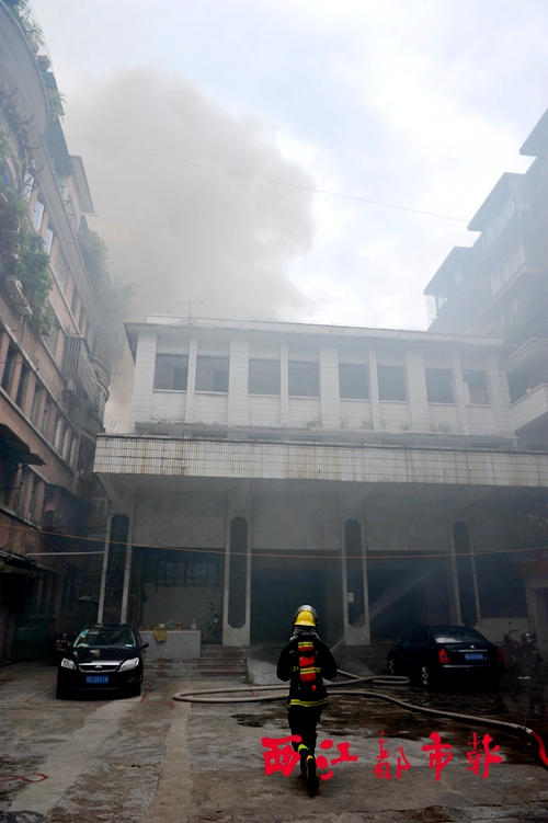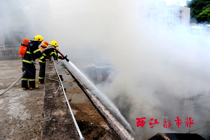 7月20日,因起火民房毗鄰市中級人民法院原辦公大院,消防官兵將水帶架設至大院內樓房頂上,對起火民房進行噴灌滅火。西江都市報記者 何鎏/攝